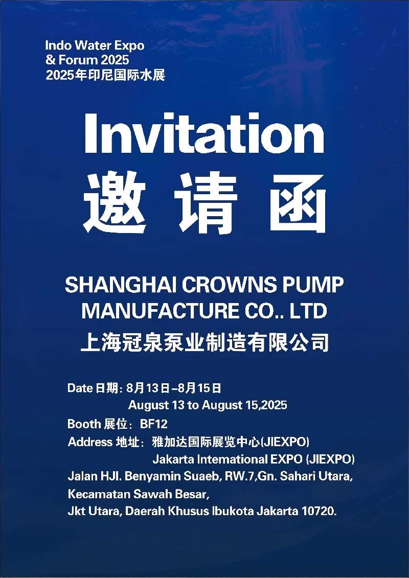 제19회 인도네시아 No.1 국제 상·폐수 기술 행사인 Indo Water 2025 Expo & Forum이 2025년 8월 13일부터 8월 15일까지 개최됩니다. 이 이벤트에서는 업계 리더, 혁신가, 전문가를 연결하여 수자원 관리, 하수, 산업 폐수, 정화, 관개 등의 분야에서 최신 기술과 솔루션을 선보일 예정입니다. 원심펌프, 소방펌프 분야의 전담 플레이어로서,수중펌프제조 부문, Guanquan Pump Industry는 이 권위 있는 모임에 참여하게 된 것을 매우 기쁘게 생각합니다. 우리 부스를 방문해 주셔서 진심으로 초대합니다!